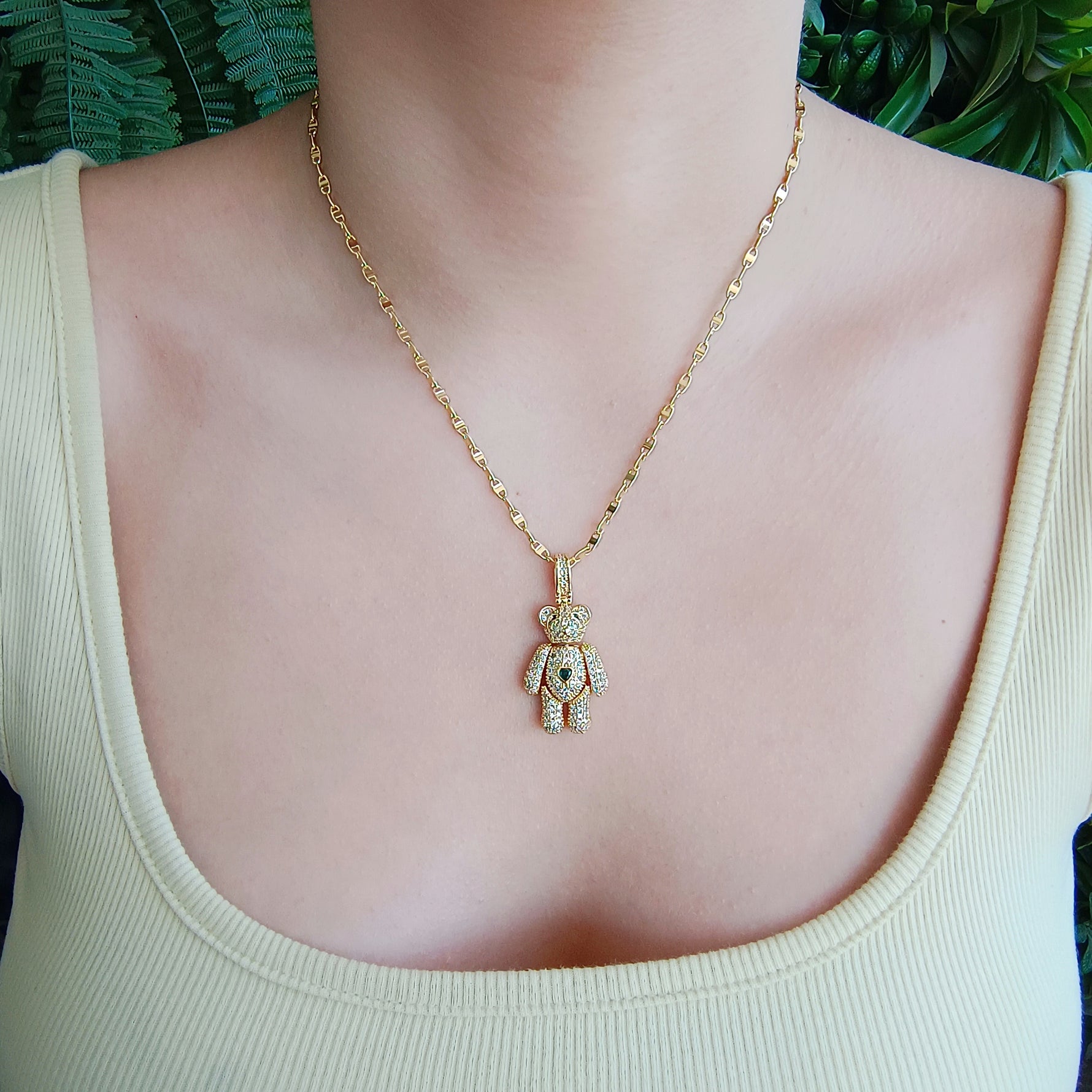 Conjunto Cadena y Colgante Osito Articulado Corazón Verde